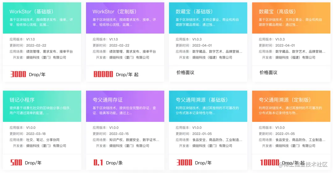 应用层主要是企业应用服务市场,上面提供了一系列由官方或开发者开发的智能合约应用及服务。企业可以在应用服务市场中选购NFT、金融、游戏、存证溯源等各种类型的服务或应用提供给用户使用。开发者可以通过海峡链的应用服务市场,为不同的企业组织,提供成熟、安全、可靠、便捷的区块链应用,同时应用服务市场也为区块链开发者提供变现渠道。