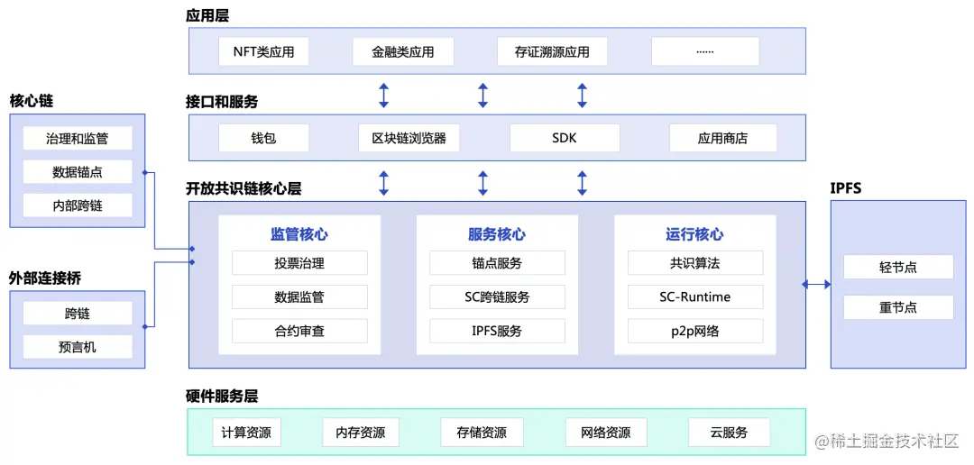 文件服务层包含了3大模块(IPFS合约模块、轻节点接入终端和重节点存储网络),并集成了许可IPFS存储网络,为区块链层提供数据支持,可实现文件的去中心化永久存储、权限管理和版本管理。同时,可以保存各类区块链应用数据,例如:将NFT的原数据存储在IPFS网络中,实现数据永久存储,不可更改,公开透明,可查询。