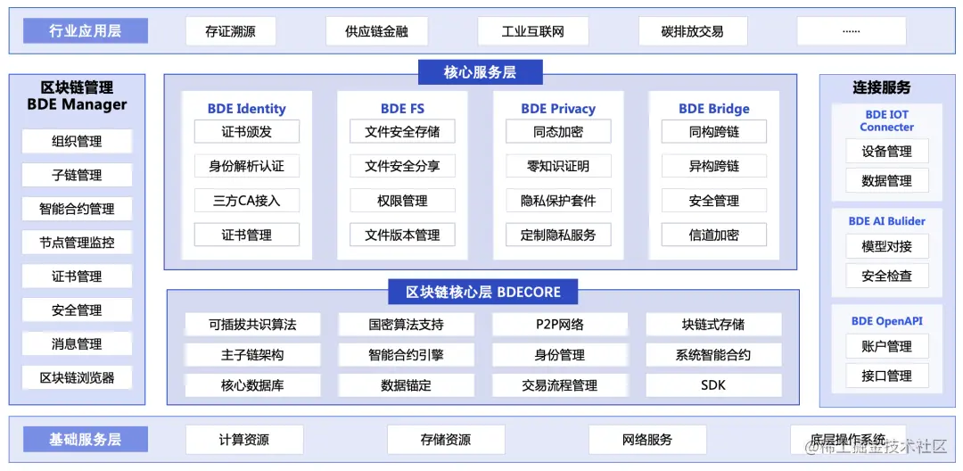 BDE Core层提供基础的区块链功能,支持国密算法,内置了丰富的智能合约,对外提供接口服务,用户大部分情况下只需对接到BDE Core即可完成DApp开发。BDE Identity完成证书颁发,证书管理等服务。BDE privacy提供用户隐私保护,隐私计算功能。BDE FS提供了对IPFS网络的访问功能。BDE Bridge为开放许可链提供了跨链功能。BDE Manager是可视化区块链管理平台,企业可以本地部署BDE Manager,它将链的管理、合约管理、状态监控等可视化,让管理变得非常容易。