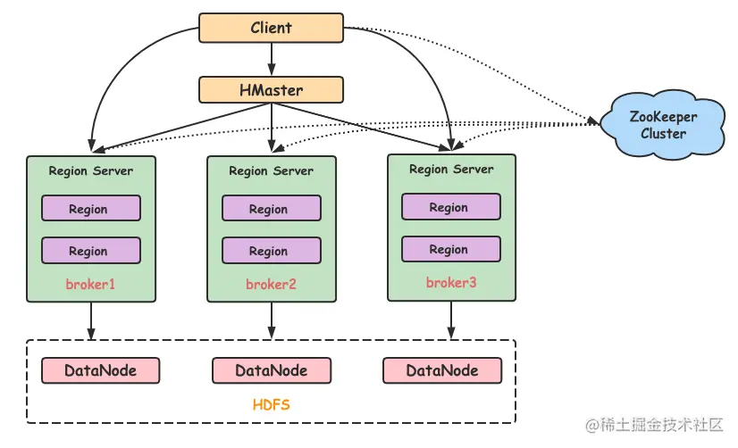 HBase 可以将数据存储在本地文件系统,也可以存储在 HDFS 文件系统。在生产环境中,HBase 一般运行在 HDFS 上,以 HDFS 作为基础的存储设施。HBase 通过 HBase Client 提供的 Java API 来访问 HBase 数据库,以完成数据的写入和读取。HBase 集群主由HMaster、Region Server 和 ZooKeeper 组成。
