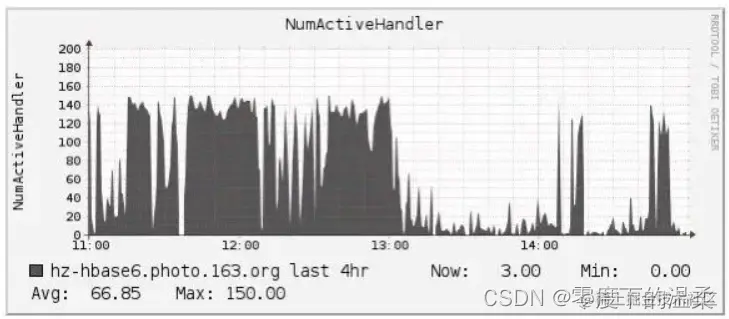 于是就继续查看其他监控信息,首先确认系统资源(主要是IO)并没有到达瓶颈,其次确认了写入的均衡性,直至看到下图,才追踪到影响其他业务写入的第二个关键点:RegionServer的handler(配置150)被残暴耗尽: