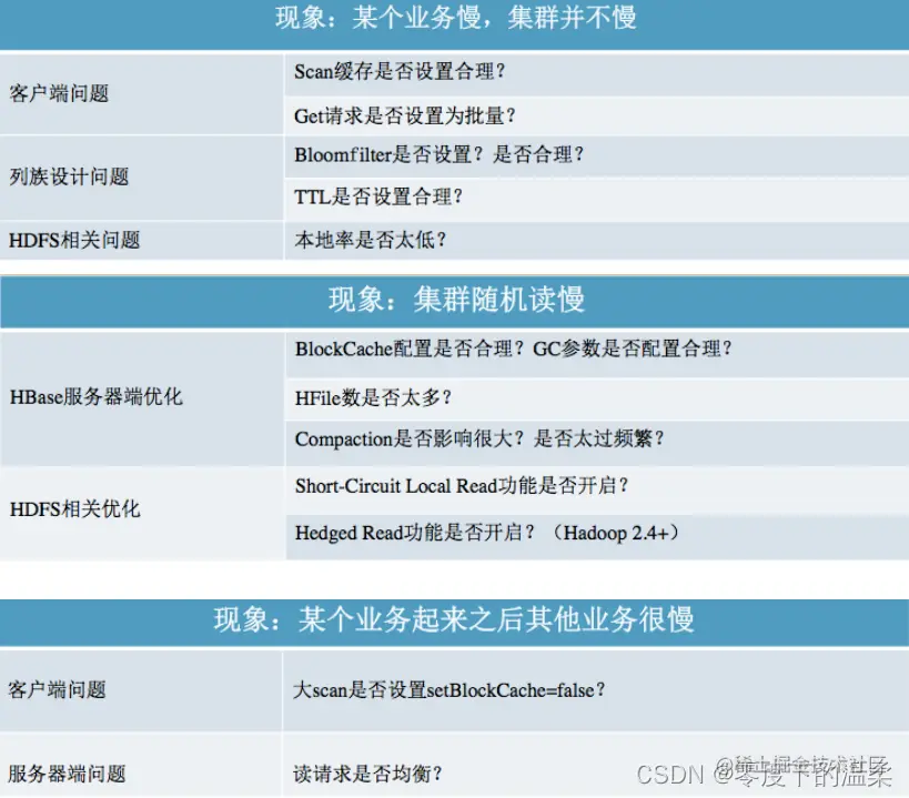 在本文开始的时候提到读延迟较大无非三种常见的表象,单个业务慢、集群随机读慢以及某个业务随机读之后其他业务受到影响导致随机读延迟很大。了解完常见的可能导致读延迟较大的一些问题之后,我们将这些问题进行如下归类,读者可以在看到现象之后在对应的问题列表中进行具体定位:
