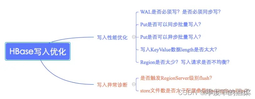 HBase数据写入通常会遇到两类问题,一类是写性能较差,另一类是数据根本写不进去。这两类问题的切入点也不尽相同,如下图所示: