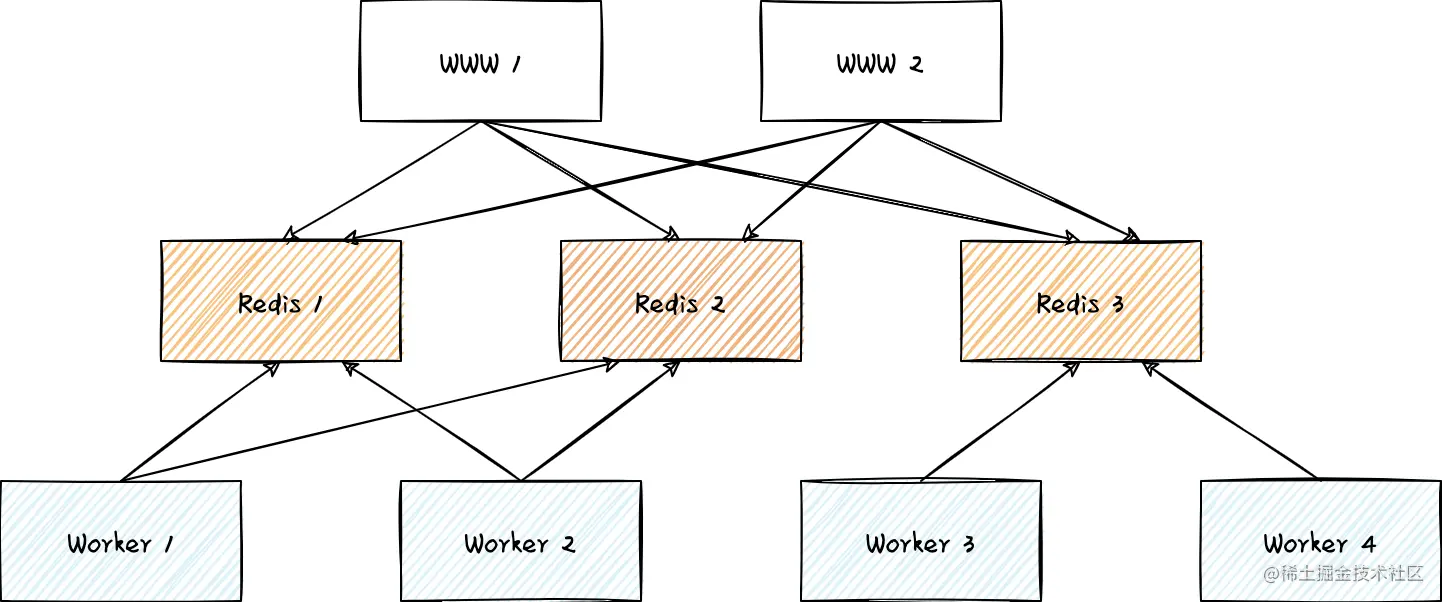 - 资源自动伸缩和负载均衡复杂。任务执行实例和任务队列建立连接,拉取任务。当任务执行实例规模较大时,对任务队列的连接资源会造成很大的压力。因此需要一层映射和分配,任务实例只和对应的任务队列连接。下图是 Slack 公司的异步任务处理系统架构。Worker 节点只和部分 Redis 实例相连。这解决了 worker 节点大规模扩展的能力,但是增加了调度和负载均衡的复杂度。