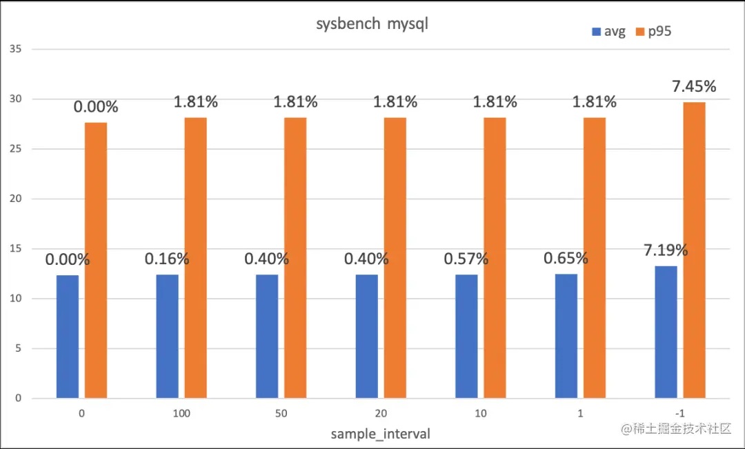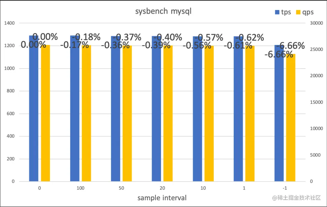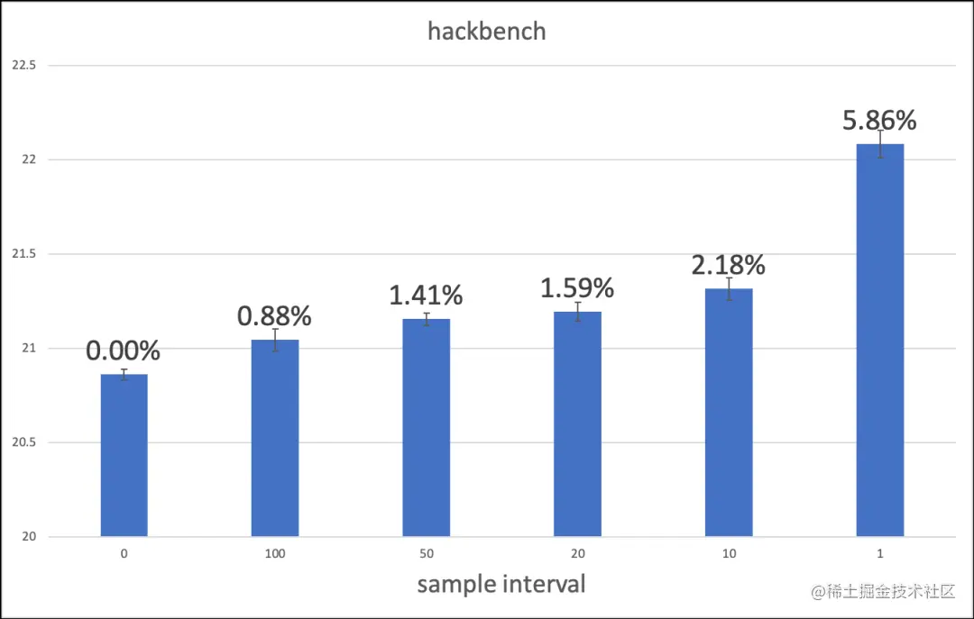 我们使用 ecs 上的裸金属机器进行测试,104vcpu 的 Intel Xeon(Cascade Lake) Platinum 8269CY。使用 hackbench 将线程设满(104),根据不同的采样时间测得性能如下: