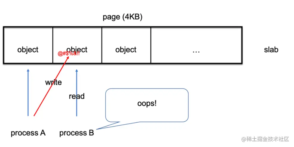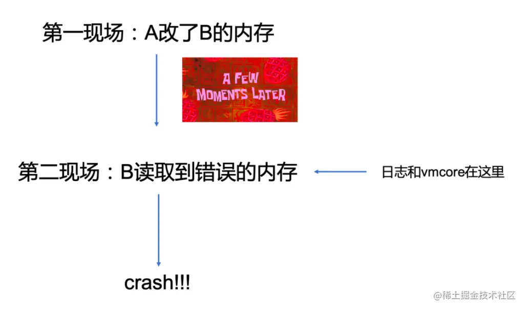在上面的例子中,宕机最后将会由用户 B 引发,从而产生的各种日志记录和 vmcore 都会把矛头指向 B。也就是说,宕机时已经是问题的第二现场了,距离内存被改的第一现场存在时间差,此时 A 可能早已销声匿迹。这时内核开发者排查了半天,认为 B 不应该出现这个错误,也不知道为什么 B 的那片内存会变成意料之外的值,就会怀疑是内存被其他人改了,但是寻找这个“其他人”的工作是很艰难的。如果运气好,宕机现场还能找出线索(例如犯人还呆在旁边,或是犯人写入的值很有特征),又或者发生了多次相似宕机从而找到关联等等。但是,也存在运气不好时没有线索(例如犯人已经释放内存消失了),甚至主动复现都困难的情况(例如隔壁没人,修改了无关紧要的数据,或者修改完被正主覆写了等等)。
