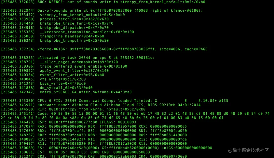 对于内存被改,抓到该行为后会在 dmesg 打印现场的调用栈。从触发现场到该内存的分配/释放情况一应俱全,从而帮助精准定位问题。