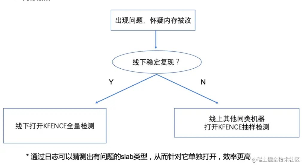 出现内存问题时,如果 vmcore 没有捕获到第一现场,无法发现端倪,这时内核同学的传统做法是切换到 debug 内核使用 KASAN 线下调试。然而线上环境复杂,有些十分隐蔽的问题无法在线下稳定复现,或者在线上时本身就属于偶发。这类棘手的问题往往只能搁置,等待下一次出现时期望能提供更多线索。因此,我们看到了 KFENCE 本身的灵活性,对它进行改进,让它成为一个能灵活调整用于线上/线下的内存问题调试工具。
