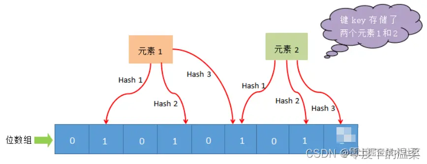 您可能会问,为什么是有可能存在?其实原因很简单,那些被置为 1 的位置也可能是由于其他元素的操作而改变的。比如,元素1 和 元素2,这两个元素同时将一个位置变为了 1(图1所示)。在这种情况下,我们就不能判定“元素 1”一定存在,这是布隆过滤器存在误判的根本原因。