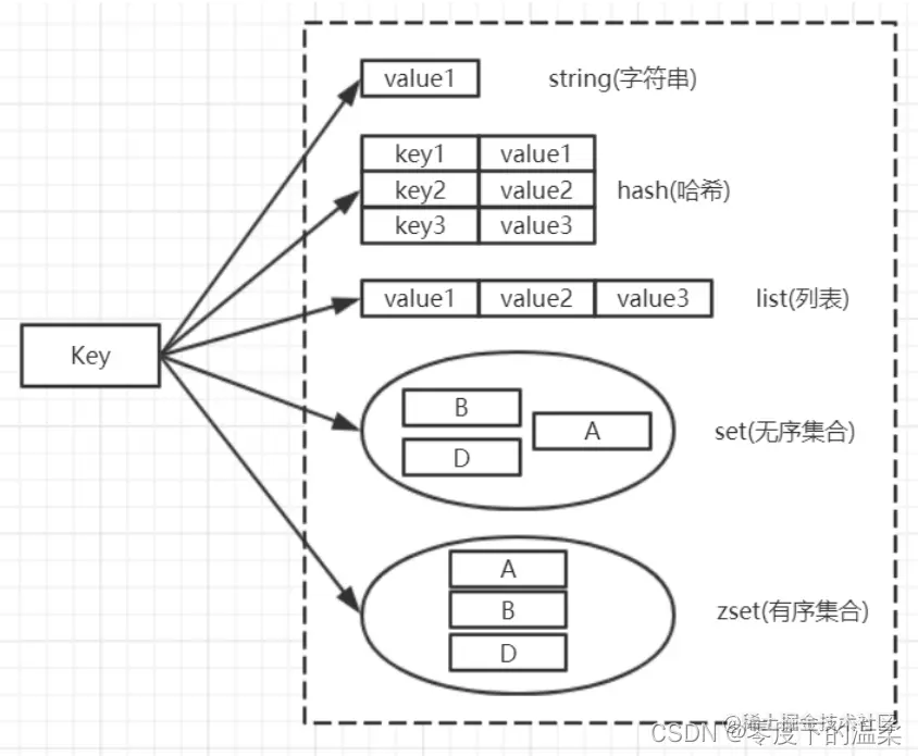 Redis 支持五种常用的数据类型:string( 字符串),hash( 哈希), list( 列表), set( 集合) 及 zsetsorted set:有序集合)。
