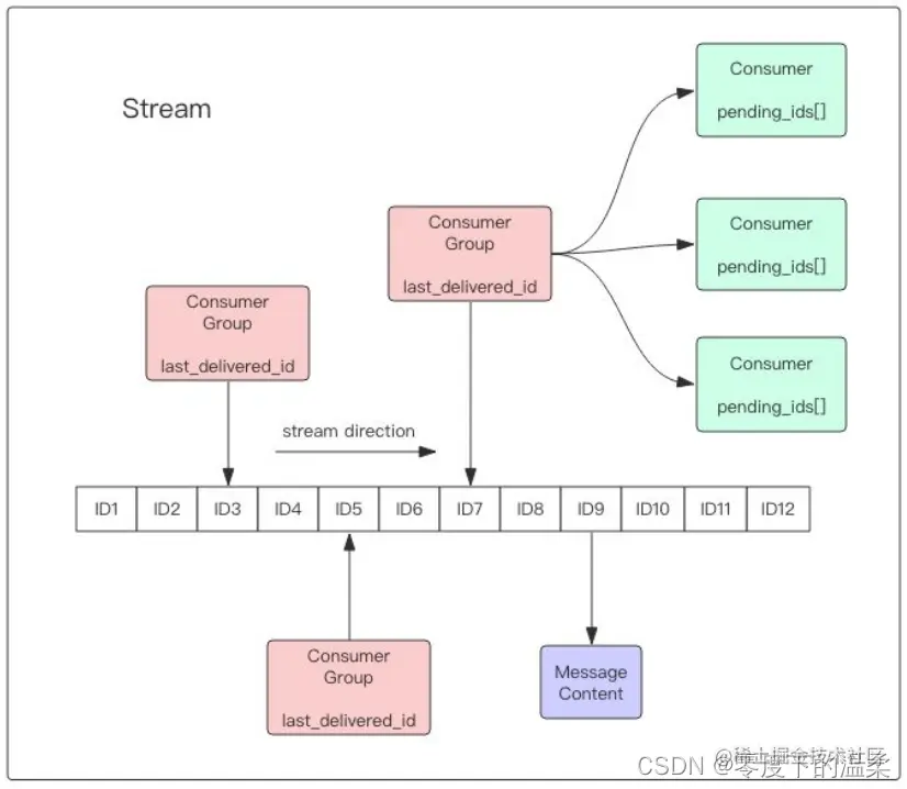 Redis Stream的结构如图所示,它有一个消息链表,将所有加入的消息都串起来,每个消息都有一个唯一的ID和对应的内容。消息是持久化的,Redis重启后,内容还在。