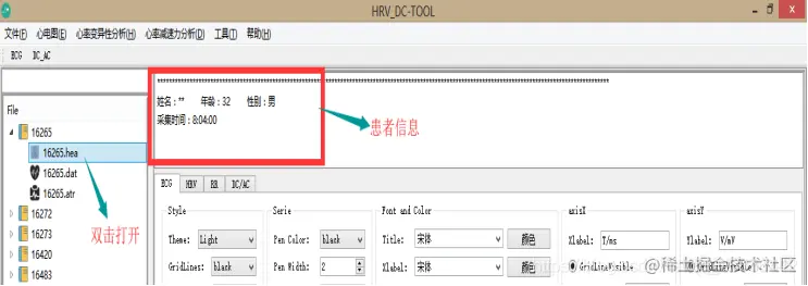 然后将患者的信息传递到UI界面,显示给用户。将采样频率、导联编号、信号数量、每信号采样数、采样开始时间等对解析dat文件有关系的信息传递给dat函数。