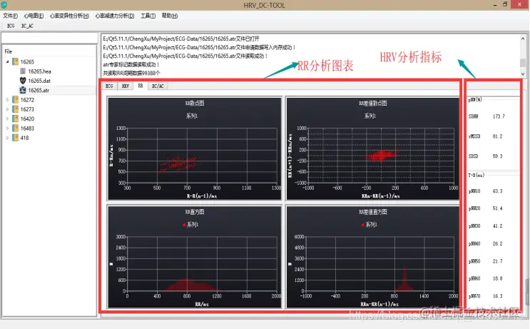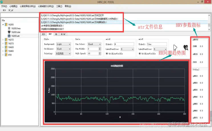 atr文件中有每一个出现的QRS中R点的时间位置,由此,后一数据与前一个数据的时间差(单位为毫秒)表示为RRn = Rn – Rn-1,计算文件中所有可得到的RR间期,并绘制RR趋势图、RR散点图、RR差值散点图、RR直方图以及RR差值直方图。