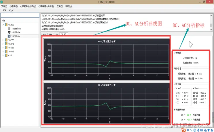 点击DC图表右侧开始按钮,程序对得到的数据进行PRSA处理,计算DC、AC的值,显示结果并绘制DC、AC的图形: