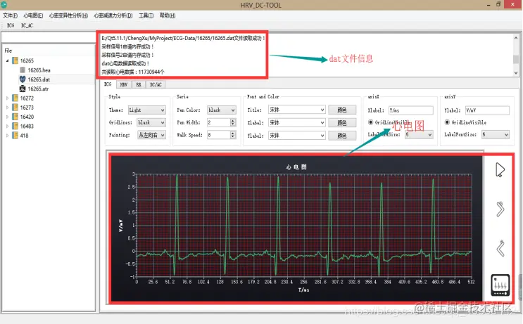 该模块主要功能是打开心电文件,并将文件中的数据通过编码格式解释为可用信号。本模块主要由C语言编写,主要分为三个功能函数: