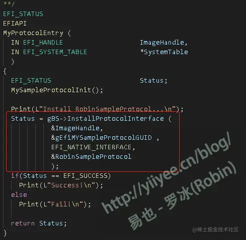 构建好Protocol后(下一节描述如何构建自己的Protocol),需要在驱动入口函数中安装。可以使用InstallProtocolInterface()或者InstallMultipleProtocolInterfaces()进行安装。UEFI spec中认为InstallMultipleProtocolInterfaces()会进行更多的错误检查,推荐使用这个函数。