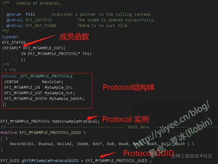 Protocol的成员函数,其函数类型必须是EFIAPI修饰的,并且第一个函数参数必须为This指针。构造好的Protocol源代码如下: