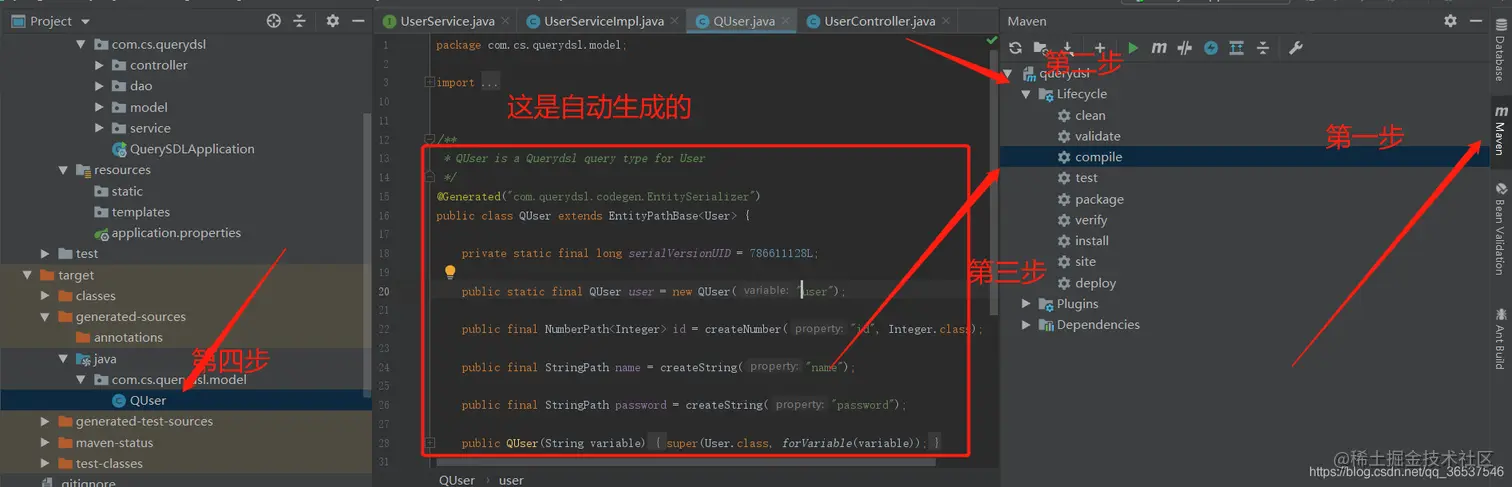 然后生成我们的 Q实体类,第一步点击右侧 Maven 然后选择第一个文件夹,双击 compile 它会自动运行,运行成功后会生成一个 QUser 的实体类 ,因为我们的实体类叫做 User 他是根据我们实体类来生成的
