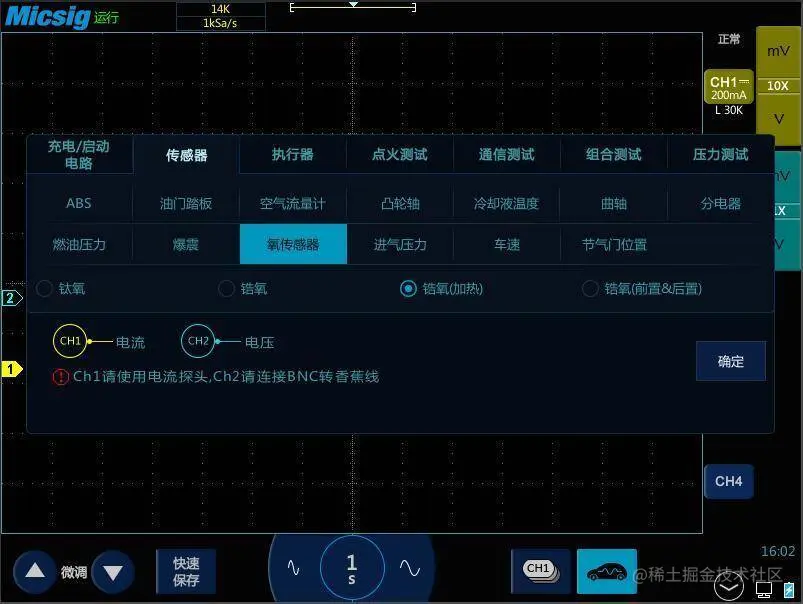 如果你使用的是ATO系列的示波器,可以打开汽车包,直接选择对应的测量项传感器-氧传感器-锆氧(加热),即可自动完成示波器各项设置。