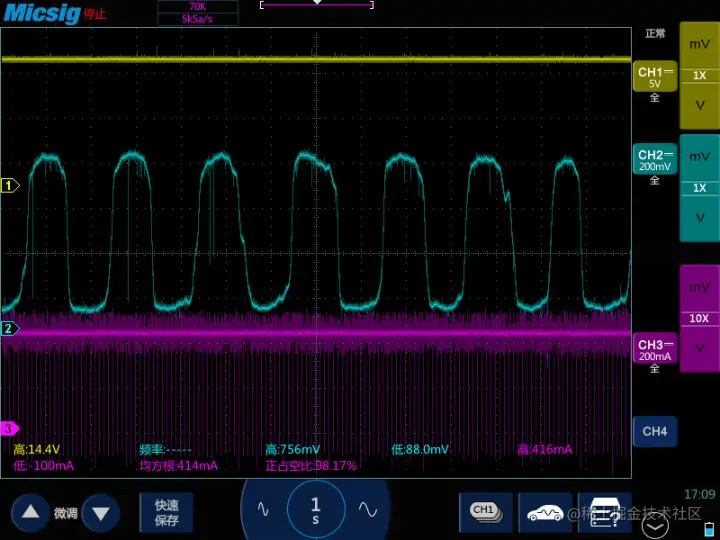 通道三显示的是加热器的电流信号,它是一个脉冲宽度调制(PWM)或方波类型的信号。温度上升后,加热器的阻抗增加。加热器的电压是来自ECM的恒定蓄电池电压(就是图中通道一测量的值),所以当加热器的阻抗增加,电流就会下降。这个波形最重要的特征不是电流脉冲的高度,而是它们的宽度。发动机的ECM通过调节每一个脉冲的宽度来控制加热器的能量。