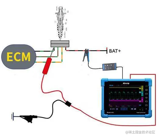 将示波器其中一个通道接上电流探头,将电流钳夹在氧传感器的其中一条黑色线上,用于测量加热器电流信号。图中连接的是通道三。