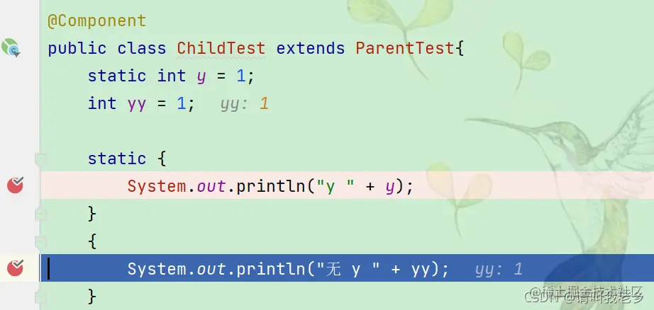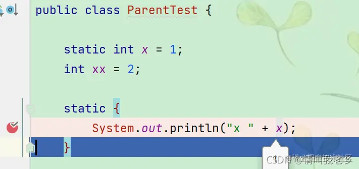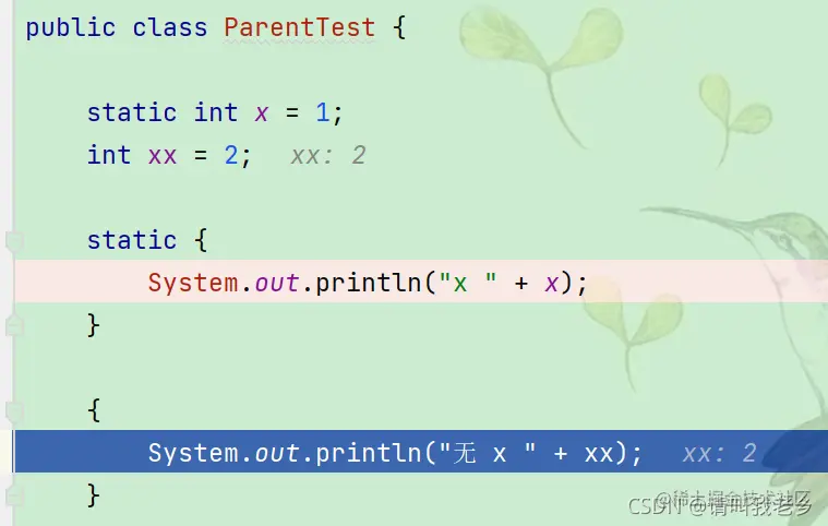 通过断点看到了日志x为1,说明先加载的static int x = 1; 然后加载的父类静态代码块