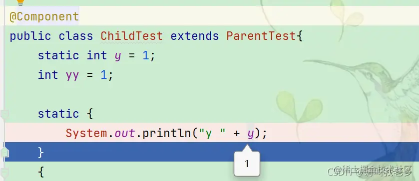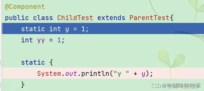 然后加载的子类静态变量y,子类静态代码块,继续走