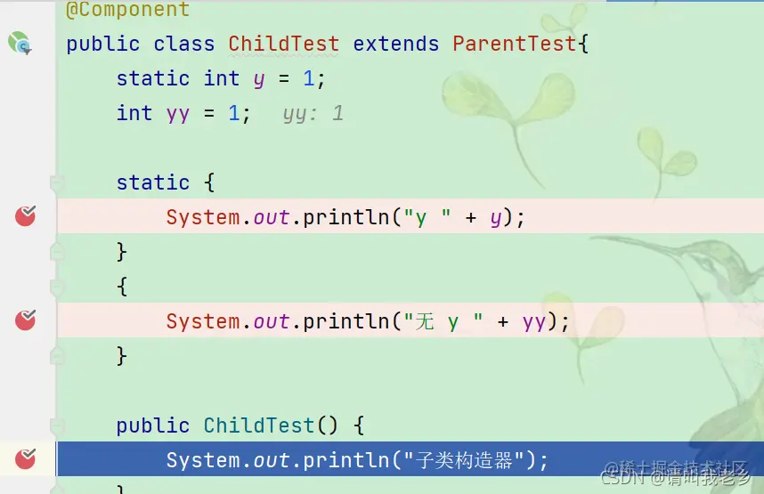 大家可以看到走了子类非静态变量,子类非静态代码块,子类构造器