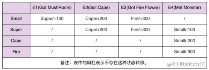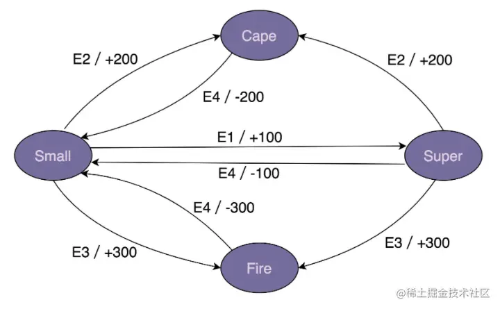 - 实际上,马里奥形态的转变就是一个状态机。其中,马里奥的不同形态就是状态机中的“状态”,游戏情节(比如吃了蘑菇)就是状态机中的“事件”,加减积分就是状态机中的“动作”。比如,吃蘑菇这个事件,会触发状态的转移:从小马里奥转移到超级马里奥,以及触发动作的执行(增加 100 积分)。