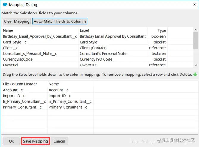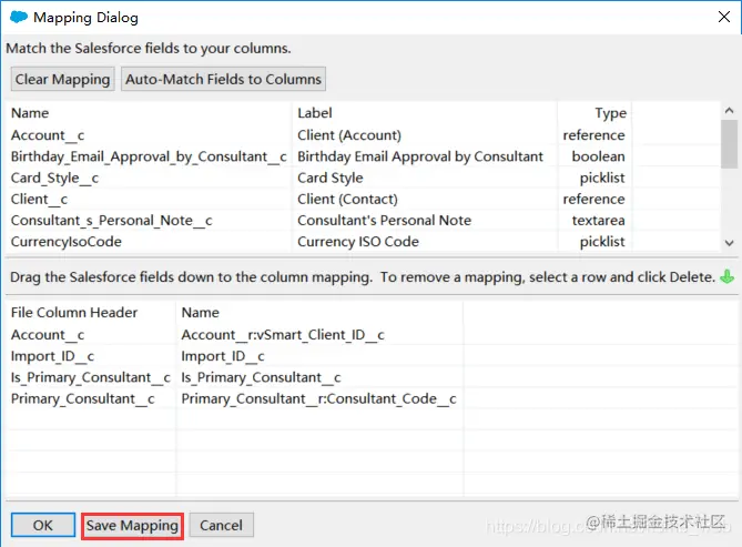 字段映射,我们可以使用Data Loader来保存字段映射的Mapping文件,核心步骤如下: a. 选择Upsert,使用关系字段外键来做映射(如我们不会直接使用ContactId和AccountId来作为导入关系字段的值,因为外部系统没有这些,这些值只有选择Upsert才能选中)