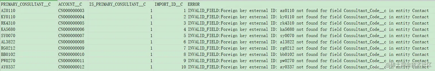 上面我提到过我需要插入的servicing consultant数据需要参考contact和account,如果data sample中的数据在sf系统没有,当然会出错呀,所以这个测试我需要先创建外键为data sample的contact和account数据后,再跑一遍命令行。