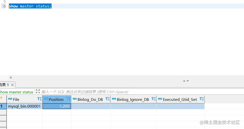 4.使用root账号登录到主库,通过 show master status; 查看file和position,很重要,在从库中配置会用到