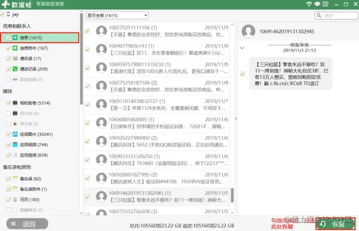 第3步:扫描完成后想找到删除的短信,只需要找到左边的“信息”按钮并点击即可进去勾选自己需要恢复的短信后点击右下角的“恢复”按钮即可开始恢复删除的短信。