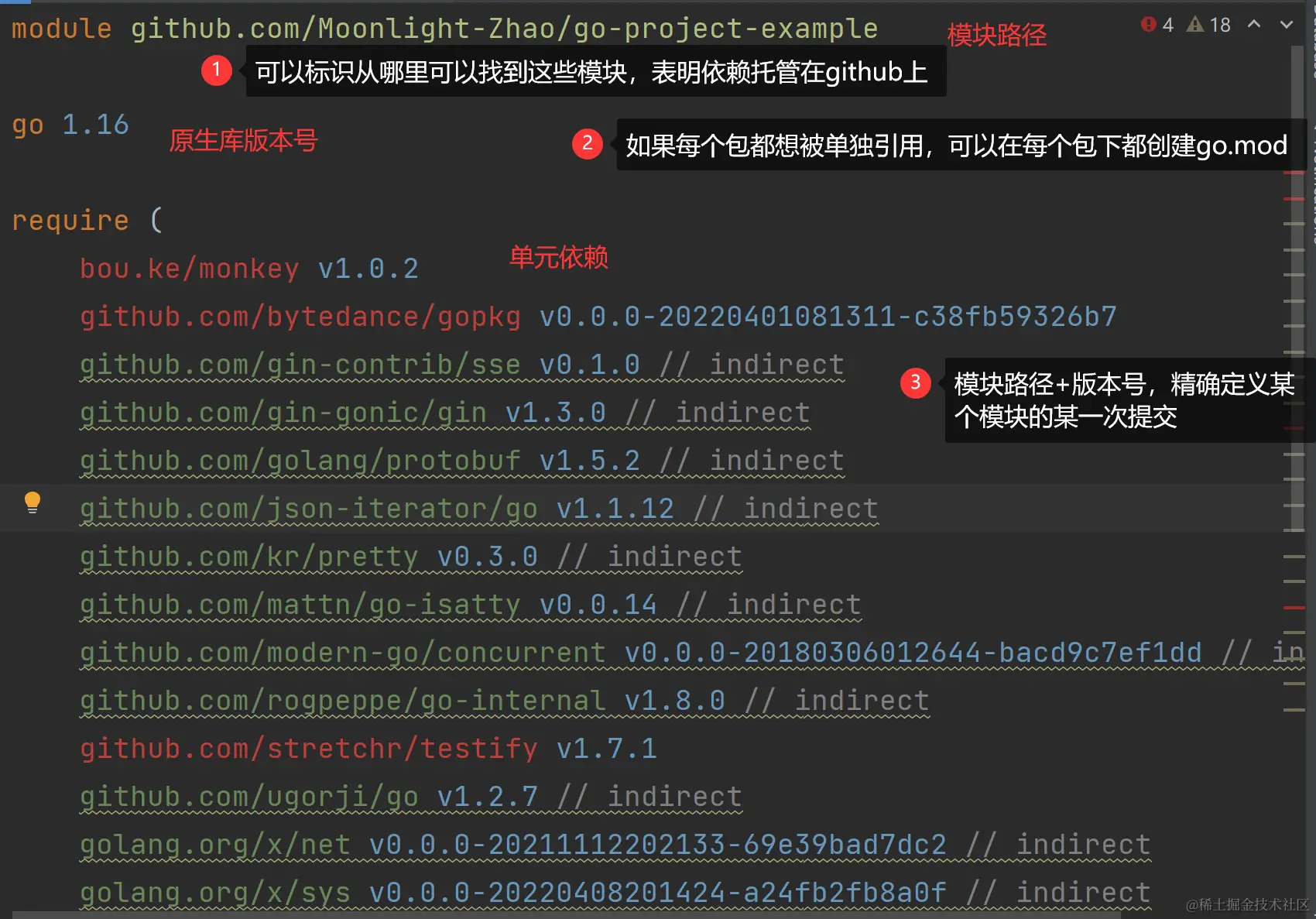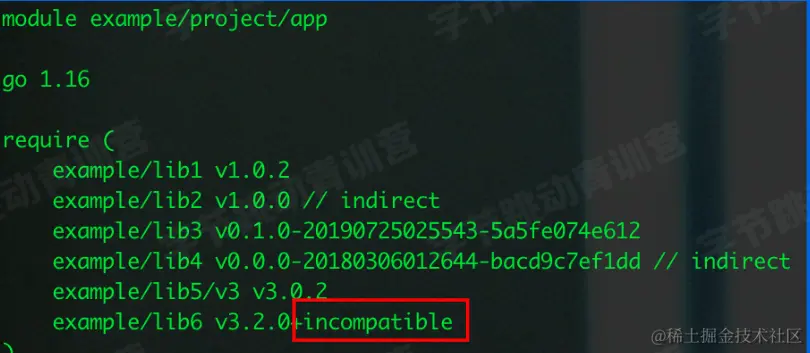 - 但是由于gomodule是1.11引入,所以这项规则提出之前已经有一些仓库打上了2或者更高版本的tag了,为了兼容这部分仓库,对于没有go.mod文件并且主版本在2或者以上的依赖,会在版本号后加上+incompatible后缀\