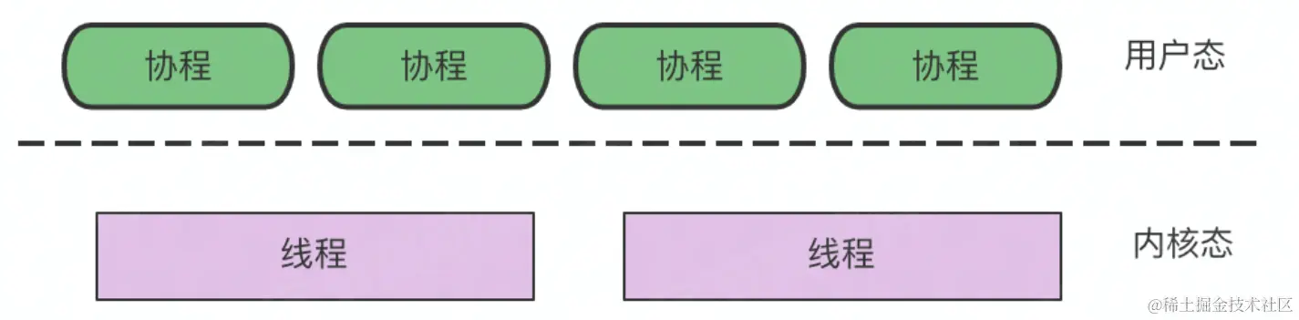 - 线程:内核态,线程跑多个协程,栈KB级别\