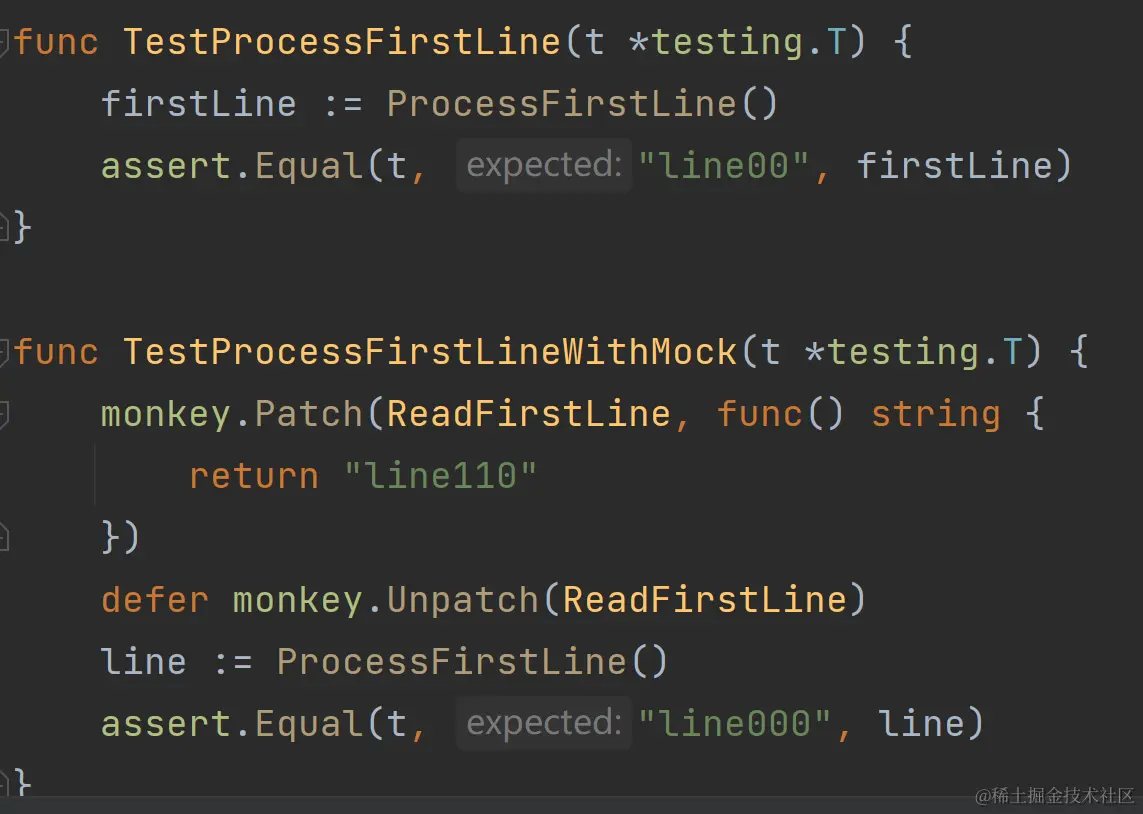 - 将文件中的第一行字符串中的11替换成00,执行单测,测试通过,而我们的单测需要依赖本地的文件,如果文件被修改或者删除测试就会失败。为了保证测试的确稳定性,我们对读取文件函数进行mock,屏蔽对于文件的依赖\