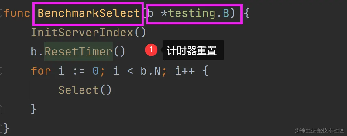 - 基准测试应该以BenchmarkXxxx命名,参数类型为testing.B\