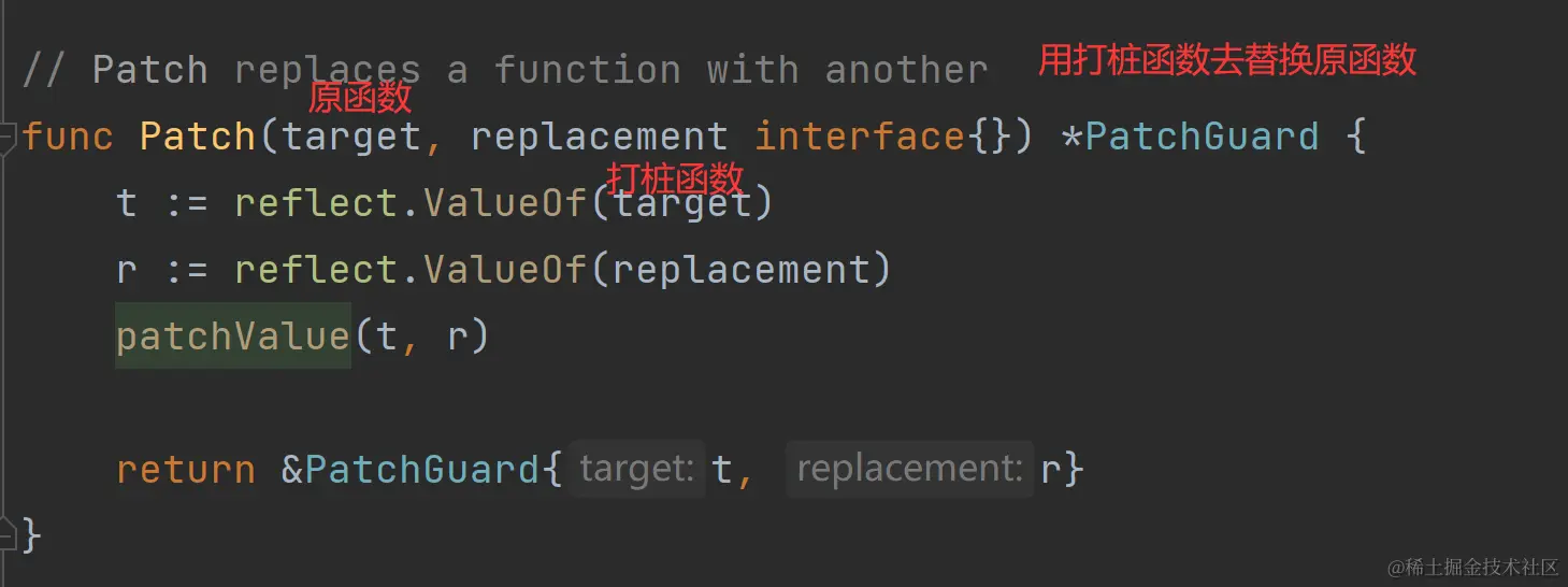 - 在运行时通过通过Go的unsafe包,能够将内存中函数的地址替换为运行时函数的地址,实现最终测试时运行打桩函数\