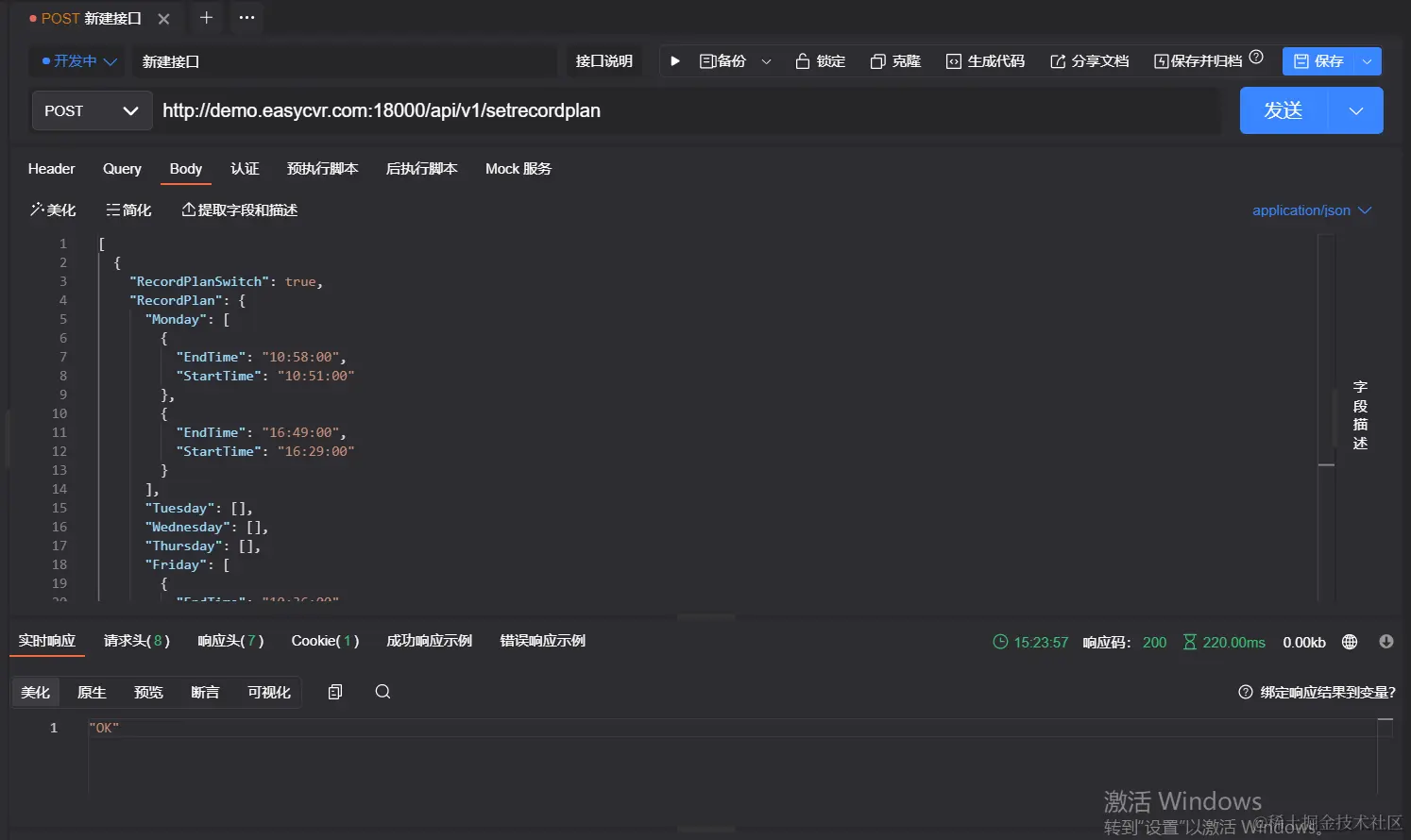 3)找到需要设置录像的设备channelId,使用post请求来调用录像计划的接口。这里我们以channelId为2的设备为例,在参数中设置录像的时间段(注意:周一到周五必须都要写在json里,如果该天不需要录像可设置为空)。若返回200 OK,则代表录像计划设置成功。