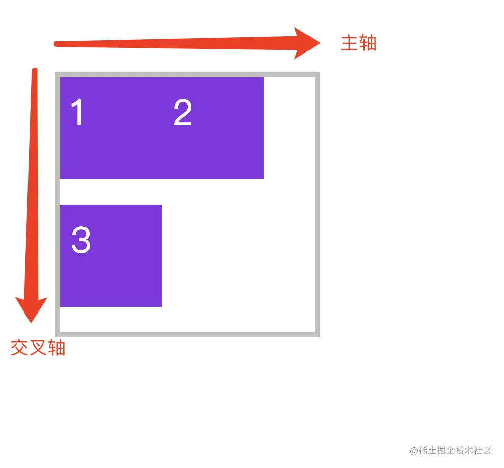 主轴和交叉轴 flex 布局是一种一维的布局,是因为一个 flexbox 一次只能处理一个维度的元素布局,一行或者一列。作为对比的是另外一个二维布局 CSS Grid Layout,可以同时处理行和列上的布局。