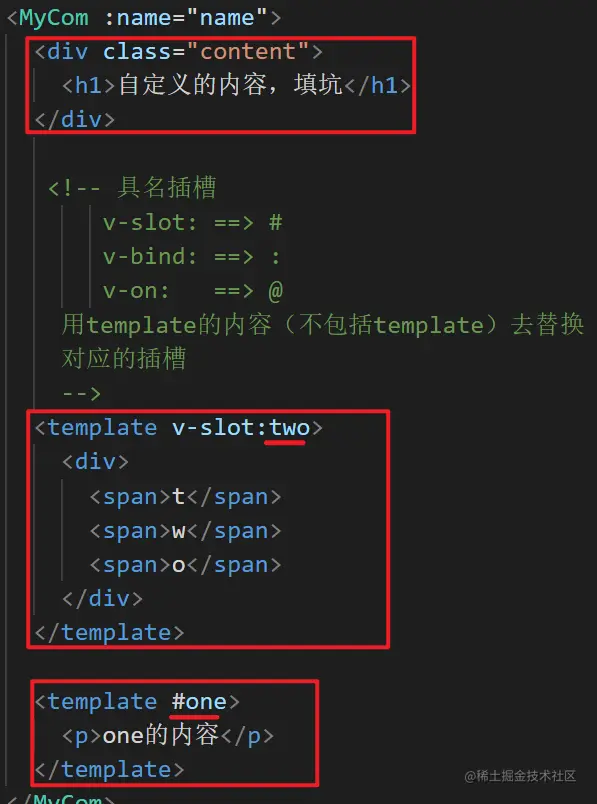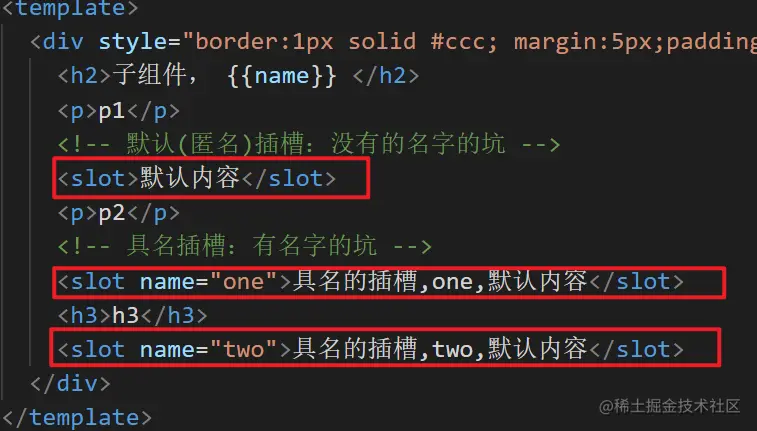 - 插槽同时可以设置name 取一个名字这样就可以给指定的slot设置指定的内容 如果不取名字一旦插槽多了 就会乱套