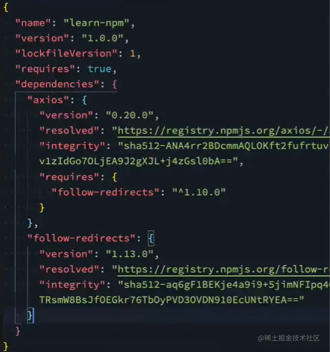 package.json文件中只看到了axios一个依赖,但在package-lock.json文件中却看到了axios和follow-redireacts两个依赖,就是因为一个库中还有可能会依赖于其它的库