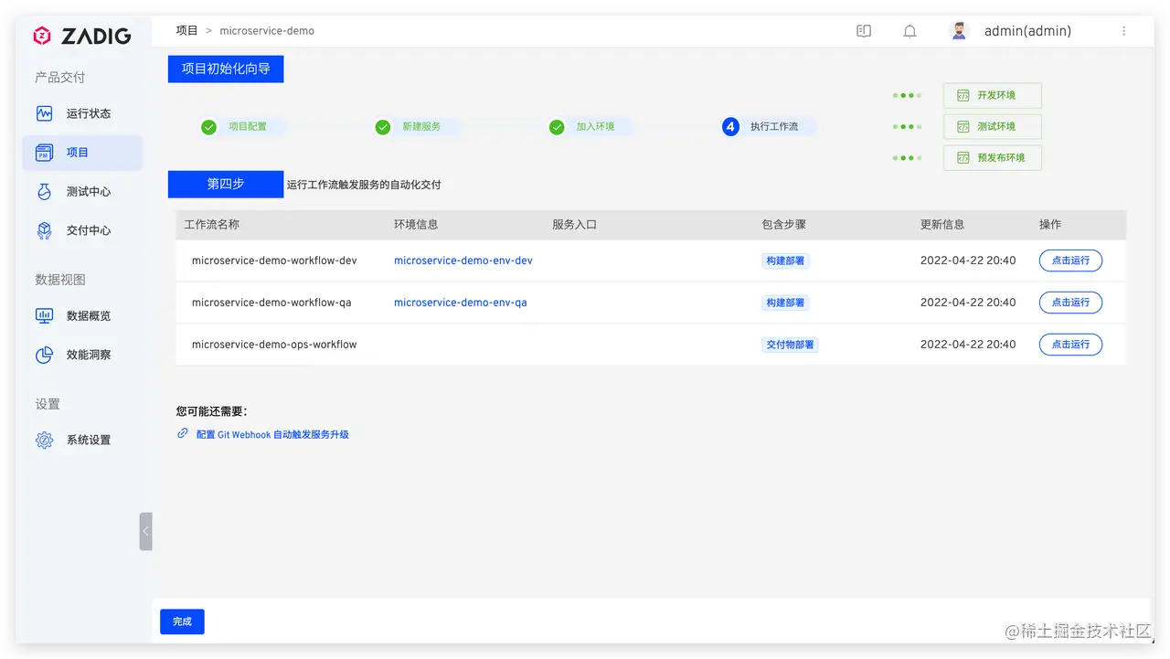 - 点击完成向导,一个有 2 个微服务的项目、2 套环境、3 条工作流已经产生,项目概览如下。