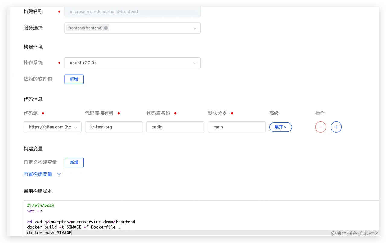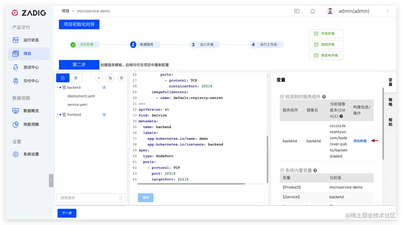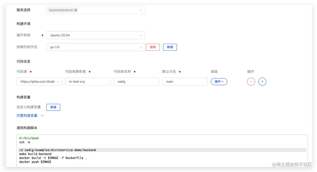 配置后端服务构建:选择 backend 服务 -> 点击 添加构建 -> 填写构建配置和构建脚本后保存。