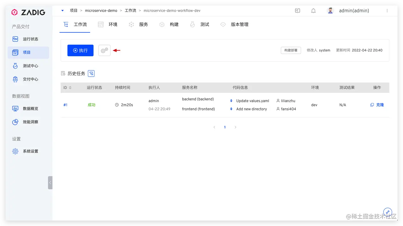 - 切换到 Zadig 系统,查看工作流
