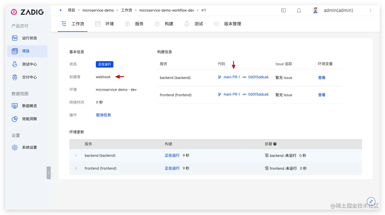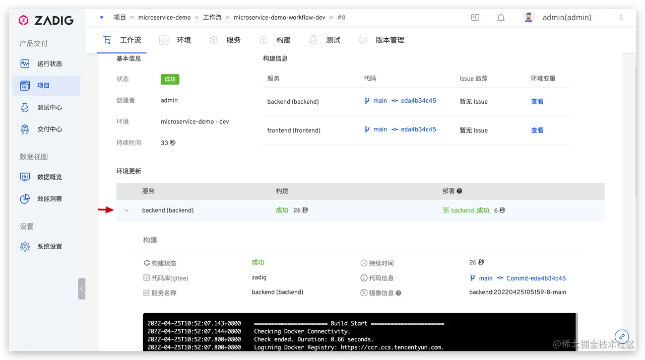 项目->microservice-demo->环境,可看到服务的镜像已被自动触发的工作流更新。