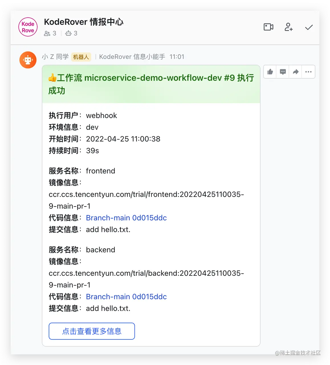 - 工作流执行后,会自动将运行结果和环境、服务等信息推送到 IM 系统中,方便及时跟进