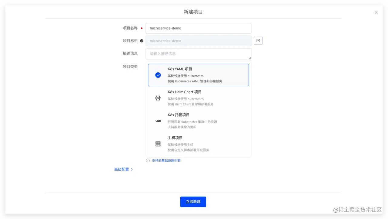 进入 Zadig 系统,点击 新建项目 -> 填写项目名称 microservice-demo -> 选择 K8s YAML 项目 -> 点击 立即创建 -> 点击 下一步。