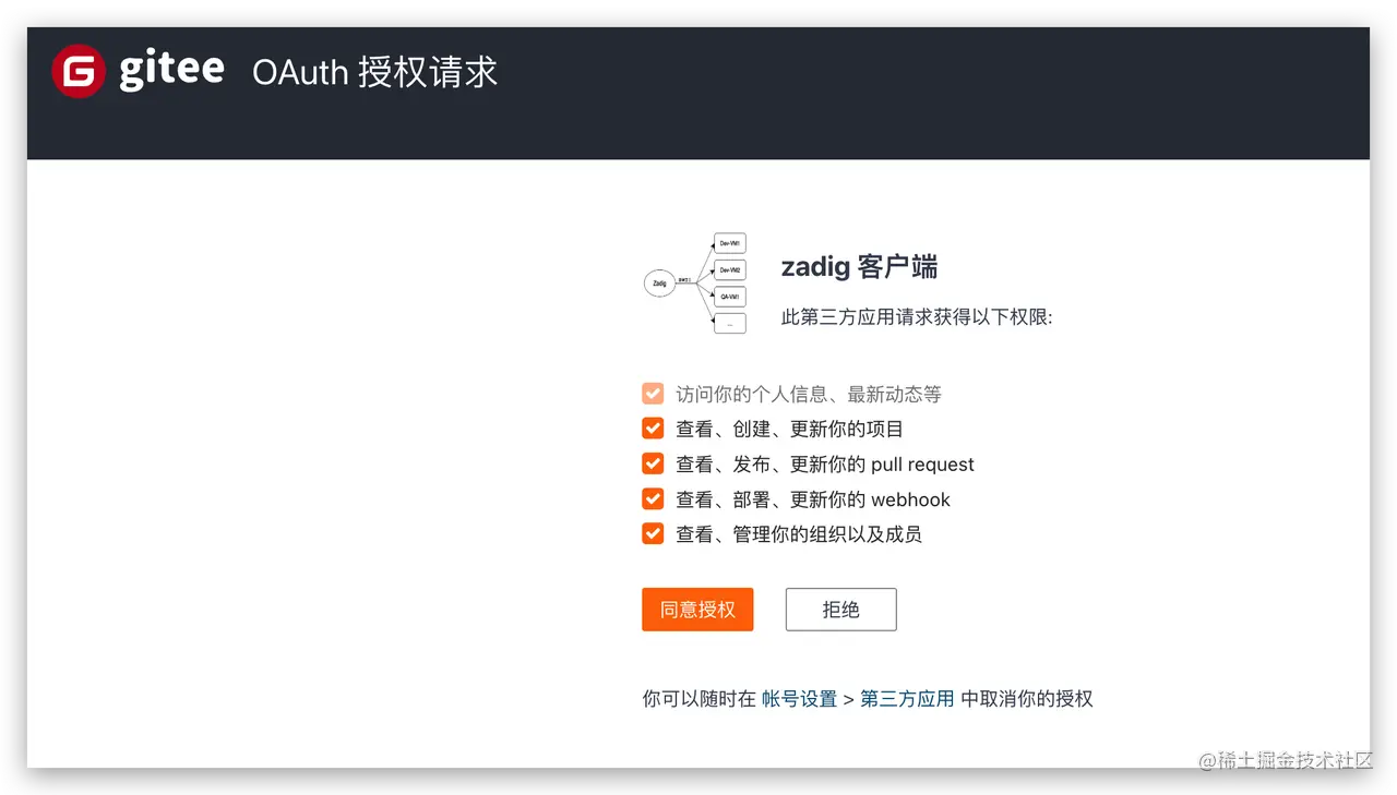 点击 同意授权 后,跳转到 Zadig 系统,至此 Gitee 集成完毕。
