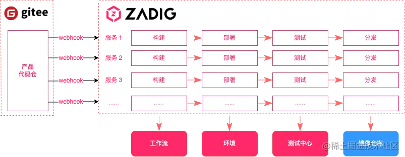 Gitee.com (码云) 是开源中国推出的代码托管平台,支持 Git 和 SVN,目前已有超过 800 万的开发者选择 Gitee,随着 Zadig 社区小伙伴对 Gitee 呼声越来越高,在刚刚发布的 Zadig V1.11.0 版本中正式加入了对 Gitee 代码源的支持,同时结合 Zadig 强大的环境管理能力和 Git Webhook 能力,可以帮助更多工程师高效、愉悦的交付。